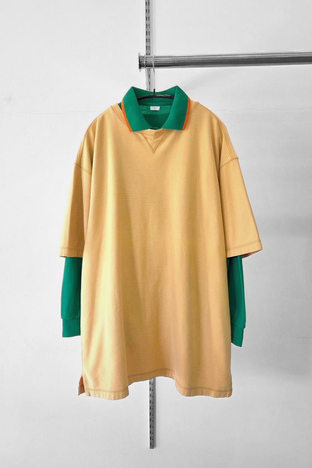独創的な襟元が目を引く長袖ポロを重ねた奥行きのあるレイヤードスタイル。